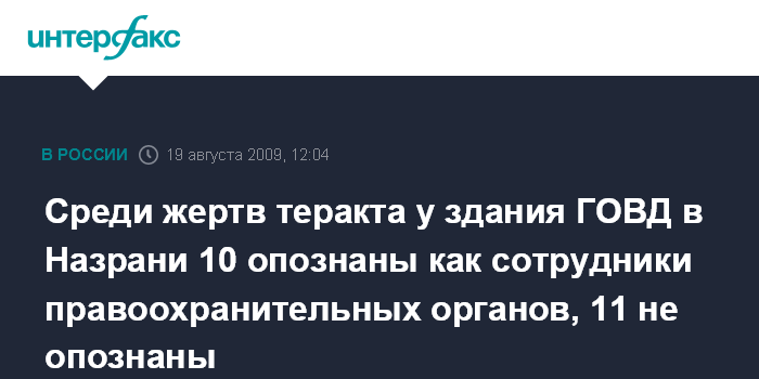 Москва. 19 августа. INTERFAX.RU – Продолжают оставаться неопознанными 11 тел, обнаруженных после взрыва "Газели" с террористом-смертником у здания ГОВД Назрани.