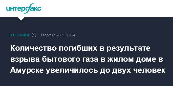 Москва. 19 августа. INTERFAX.RU – Еще одного погибшего извлекли спасатели из-под завалов в пострадавшем от взрыва газа доме в городе Амурске (Комсомольский район Хабаровского края).