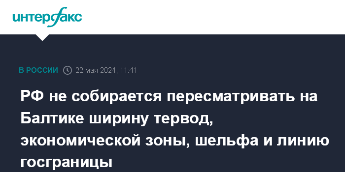 Москва. 22 мая. INTERFAX.RU - Россия не собирается пересматривать на Балтике ширину территориальных вод, экономической зоны, шельфа и линию госграницы, заявил военно-дипломатический источник.