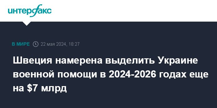 Москва. 22 мая. INTERFAX.RU - Шведское правительство меньшинства и поддерживающая его партия "Шведские демократы" договорилось о том, чтобы направить Украине военной помощи в 2024 - 2026 годах еще на $7,01 млрд, сообщают в среду западные СМИ.