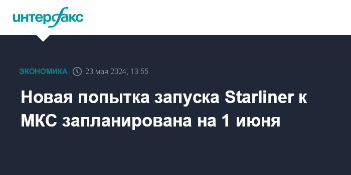 Москва. 23 мая. INTERFAX.RU - Попытка запуска нового американского корабля CST-100 Starliner корпорации Boeing с двумя астронавтами на борту к Международной космической станции (МКС), которая несколько раз переносилась из-за технических проблем, будет предпринята 1 июня, сообщило NASA.