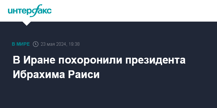 Москва. 23 мая. INTERFAX.RU - Погибшего при крушении вертолета президента Ирана Ибрахима Раиси похоронили в четверг в Мавзолее имама Резы в городе Мешхеде, который является родиной покойного главы государства, сообщает Associated Press (AP).