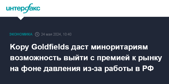 Москва. 24 мая. INTERFAX.RU - Шведская Kopy Goldfields, производственные активы которой представлены "Амур Золотом", даст миноритариям опцию выхода из капитала с премией к рынку на фоне давления из-за присутствия компании в России.