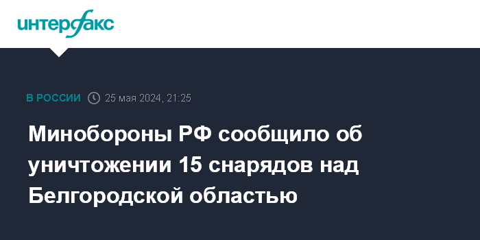 Москва. 25 мая. INTERFAX.RU - Министерство обороны России заявило, что в субботу около 19:00 дежурными средствами ПВО над Белгородской областью уничтожено 15 украинских снарядов реактивной системы залпового огня "Вампир".