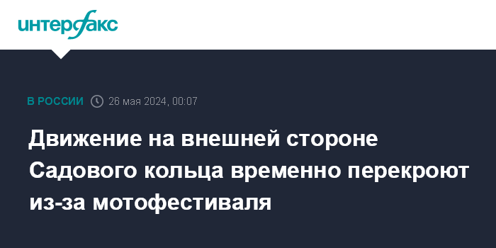 Москва. 26 мая. INTERFAX.RU - Движение для транспорта будет временно закрыто на внешней стороне Садового кольца и на ряде столичных улиц в субботу в связи с проведением московского мотофестиваля.
