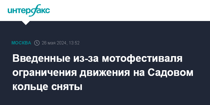 Москва. 26 мая. INTERFAX.RU - Временные ограничения движения транспорта на внешней стороне Садового кольца и на ряде улиц Москвы отменены, сообщили в столичном департаменте транспорта в воскресенье.