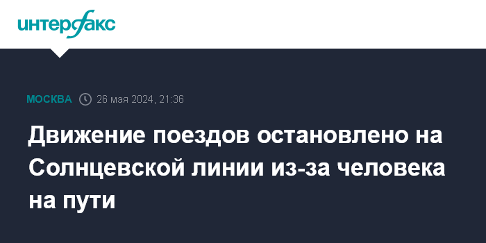 Москва. 26 мая. INTERFAX.RU - На Солнцевской линии столичного метро нет движения поездов из-за человека на пути, сообщили в пресс-службе департамента транспорта Москвы.
