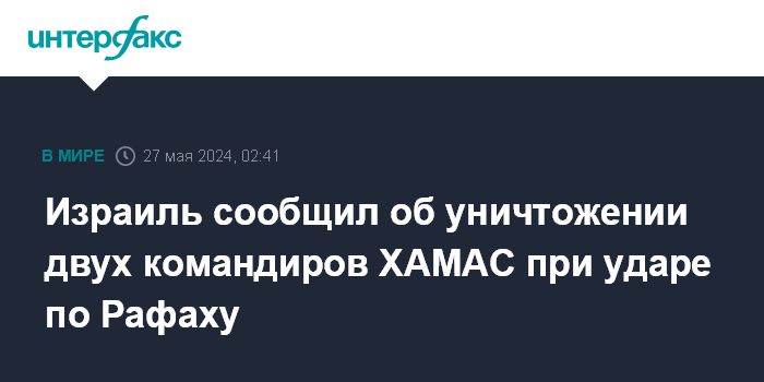 Москва. 27 мая. INTERFAX.RU - Израильские военные утверждают, что в результате удара по Рафаху в воскресенье были убиты два высокопоставленных представителя радикальной группировки ХАМАС.
