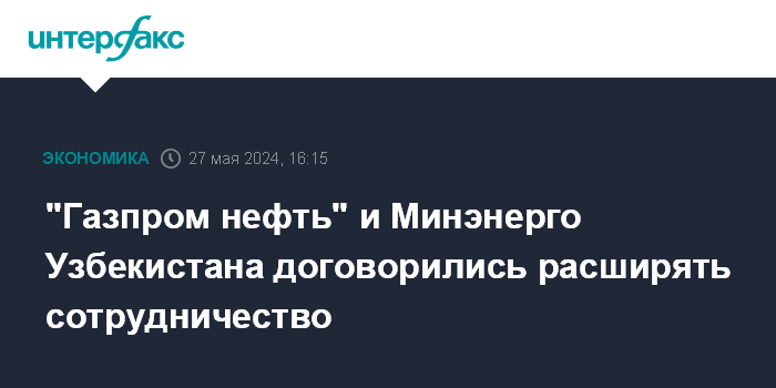 Москва. 27 мая. INTERFAX.RU - ПАО "Газпром нефть" и Министерство энергетики Узбекистана подписали "дорожную карту" по расширению сотрудничества. Этот документ назван на сайте Кремля в перечне документов, подписанных в рамках визита президента России Владимира Путина в республику Узбекистан.