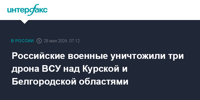 Москва. 28 мая. INTERFAX.RU - Силы противовоздушной обороны (ПВО) сбили за ночь три украинских беспилотника самолетного над Курской и Белгородской областями, сообщили в Минобороны РФ во вторник.