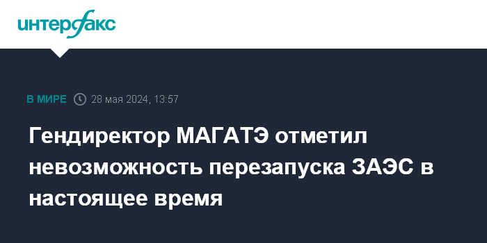 Москва. 28 мая. INTERFAX.RU - Перезапуск Запорожской АЭС и возобновление генерации на станции сейчас невозможны, сказал журналистам гендиректор МАГАТЭ Рафаэль Гросси после встречи в Калининграде с главой "Росатома" Алексеем Лихачевым.