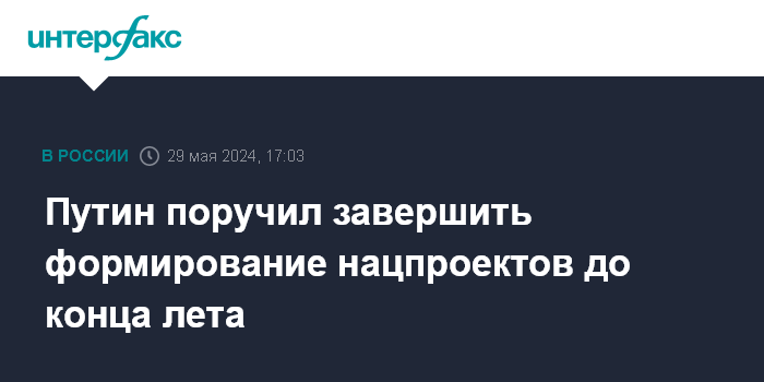 Москва. 29 мая. INTERFAX.RU - Президент Владимир Путин поручил чиновникам до конца лета доработать и скоординировать национальные проекты, рассчитанные на период до 2030 года.