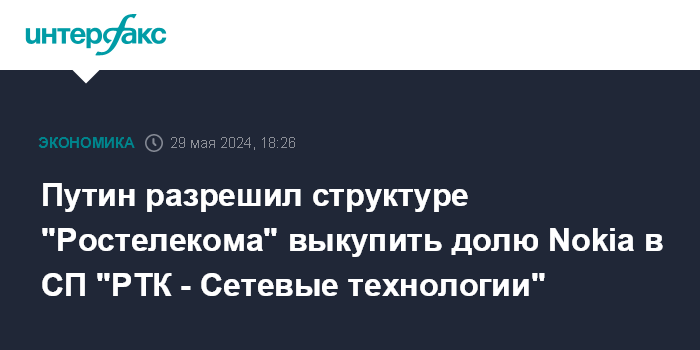 Москва. 29 мая. INTERFAX.RU - Президент РФ Владимир Путин разрешил ООО "Рестрим" (структура ПАО "Ростелеком") выкупить 49%-ную долю Nokia Solutions & Networks в СП "РТК - Сетевые технологии". Соответствующее распоряжение опубликовано на портале правовой информации.