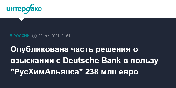 Опубликована часть решения о взыскании с Deutsche Bank в пользу "РусХимАльянса" 238 млн евро