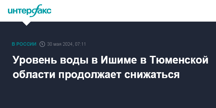 Москва. 30 мая. INTERFAX.RU - Уровень воды в Ишиме снизился за минувшие сутки во всех населенных пунктах Тюменской области, в которых протекает река, сообщает информационный центр регионального правительства в четверг.