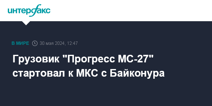 Москва. 30 мая. INTERFAX.RU - Ракета-носитель "Союз-2.1а" с транспортным грузовым кораблем "Прогресс МС-27" стартовала с космодрома Байконур, следует из трансляции "Роскосмоса".