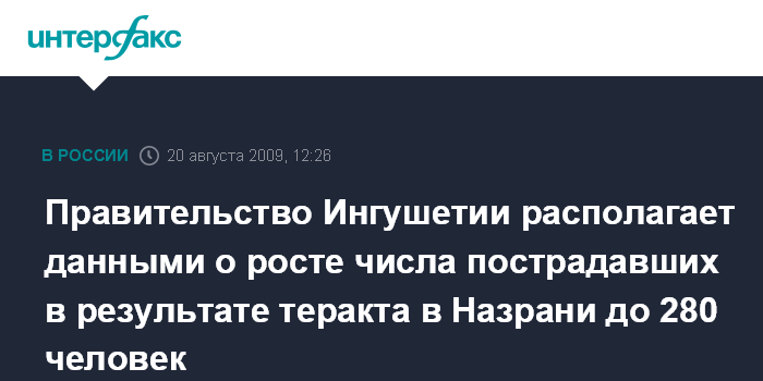 Москва. 20 августа. INTERFAX.RU - Количество пострадавших в результате взрыва у здания ГУВД в Назрани выросло до 280 человек, сообщил в четверг агентству "Интерфакс-Юг" представитель правительства Ингушетии.