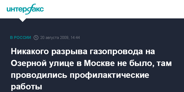 Москва. 20 августа. INTERFAX.RU - На Озерной улице на юге Москвы никакого взрыва газопровода в четверг не было.