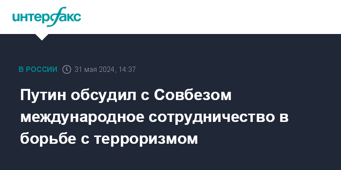 Москва. 31 мая. INTERFAX.RU - Президент Владимир Путин обсудил с членами Совета безопасности вопрос укрепления международного сотрудничества в сфере борьбы с терроризмом.