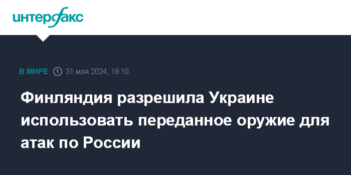 Москва. 31 мая. INTERFAX.RU - Переданное Финляндией Украине оружие можно использовать для атак по России, заявил финский президент Александр Стубб.