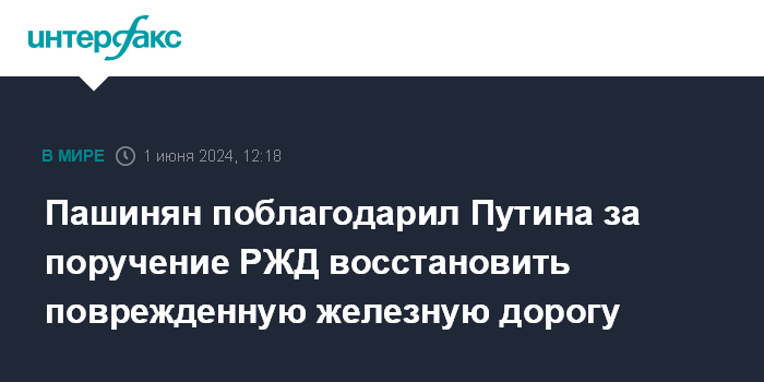 Пашинян поблагодарил Путина за поручение РЖД восстановить поврежденную железную дорогу