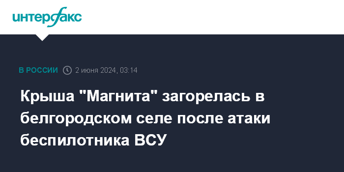 Москва. 2 июня. INTERFAX.RU - В селе Ивня Белгородской области в результате атаки украинского дрона загорелась крыша магазина "Магнит", никто не пострадал, сообщил глава региона Вячеслав Гладков в ночь на воскресенье.