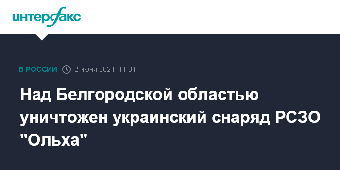 Москва. 2 июня. INTERFAX.RU - Российские военные сообщили об уничтожении украинского снаряда реактивной системы залпового огня "Ольха" над Белгородской областью.