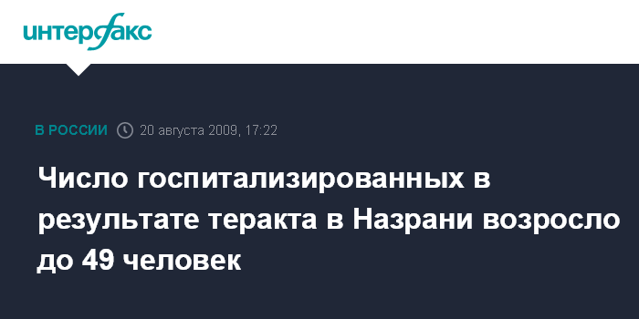 Москва. 20 августа. INTERFAX.RU - В правительстве Ингушетии констатируют рост численности обратившихся за помощью из тех, кто пострадал в теракте 17 августа в ГОВД Назрани. Как сообщил агентству "Интерфакс-Юг" в четверг источник в правительстве Ингушетии, в настоящее время на стационарном лечении находятся 49 пострадавших, только в среду госпитализированы 16 человек. Состояние всех пострадавших, находящихся в больницах, оценивается как удовлетворительное. Рост числа госпитализируемых, по мнению собеседника агентства, связан с обострением ранений среди амбулаторно проходящих лечение после теракта 17 августа.