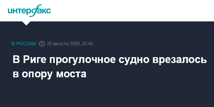 Рига. 20 августа. INTERFAX.RU - Речной трамвай Vecriga врезался в опору рижского Каменного моста, по всей вероятности, по вине экипажа, члены которого находились в состоянии алкогольного опьянения, сообщил в четверг агентству BNS представитель государственной полиции Айгар Берзиньш.
