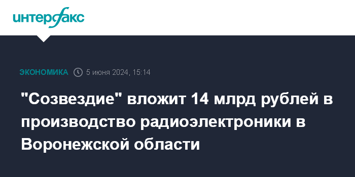 Москва. 5 июня. INTERFAX.RU - АО "Концерн "Созвездие" (входит в холдинг "Росэлектроника" госкорпорации "Ростех") планирует направить 14 млрд рублей на строительство предприятия по выпуску радиоэлектроники в индустриальном парке "Масловский" под Воронежем, сообщила пресс-служба правительства региона.