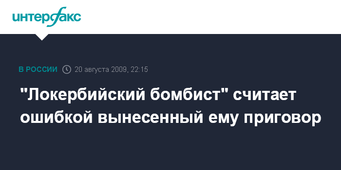 Лондон. 20 августа. ИНТЕРФАКС - Агент ливийской разведки Абдельбасет аль-Меграхи, освобожденный из тюрьмы в четверг по решению правительства Шотландии "из сострадания к тяжелой болезни", заявил об ошибочности своего приговора, сообщает британский телеканал "Скай-ньюс".