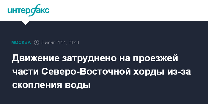Москва. 5 июня. INTERFAX.RU - Скопление воды образовалось на проезжей части на Северо-Восточной хорде (СВХ), движение затруднено, сообщили в столичном департаменте транспорта.