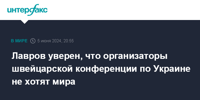 Москва. 5 июня. INTERFAX.RU - Глава МИД РФ Сергей Лавров заявил, что организаторы предстоящей в Швейцарии международной конференции по Украине не стремятся к прекращению конфликта.