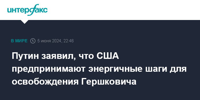 Москва. 5 июня. INTERFAX.RU - США предпринимают энергичные шаги для освобождения репортера The Wall Street Journal Эвана Гершковича, но такие вопросы должны решаться только на основе взаимности, заявил президент РФ Владимир Путин.
