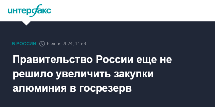 Москва. 6 июня. INTERFAX.RU - Правительство пока не принимало решения о закупке в резерв алюминия для поддержки отрасли в условиях введенных западными странами ограничений на поставку российской продукции.