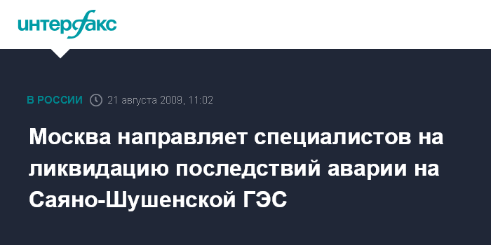 Москва направляет специалистов на ликвидацию последствий аварии на Саяно-Шушенской ГЭС