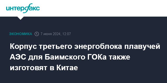 Москва. 7 июня. INTERFAX.RU - Госкорпорация "Росатом" заказала изготовление корпуса третьего энергоблока для энергоснабжения Баимского ГОКа там же, где и для первых двух – в Китае. Об этом сообщил "Интерфаксу" в кулуарах ПМЭФ замгендиректора госкорпорации Андрей Никипелов, курирующий машиностроение.