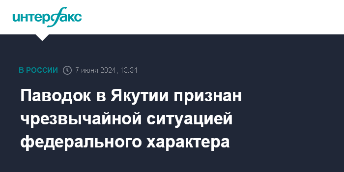 Москва. 7 июня. INTERFAX.RU - Наводнению в Якутии присвоили статус федеральной ЧС, сообщил глава республики Айсен Николаев.