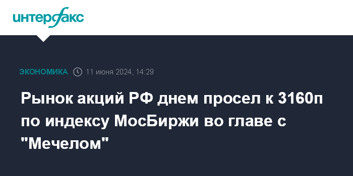 Москва. 11 июня. INTERFAX.RU -Рынок акций РФ днем во вторник остается под давлением продавцов на фоне разнополярных сигналов с внешних фондовых площадок, снижения сырья (проседают нефть и металлы) и в преддверии выходного в среду (День России). Индекс МосБиржи опустился в район 3160 пунктов во главе с бумагами "Мечела" (-4,1%), подросли акции "Аэрофлота" (+2,3%) после выхода операционного отчета за май.
