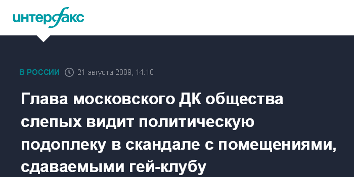 Москва. 21 августа. INTERFAX.RU - Дом культуры Всероссийского общества слепых (ВОС), который расположен в Северном административном округе (САО) Москвы не получал документов из прокуратуры о незаконности сдачи внаем помещений гей-клубу "Душа и тело", а директор Дома культуры Владимир Баженов полагает, что шум вокруг этой истории имеет политический подтекст.