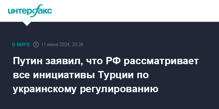Москва. 11 июня. INTERFAX.RU - Россия с большим уважением относится к инициативам Турции по урегулированию украинского кризиса и ситуации в Черном море, заявил президент РФ Владимир Путин.