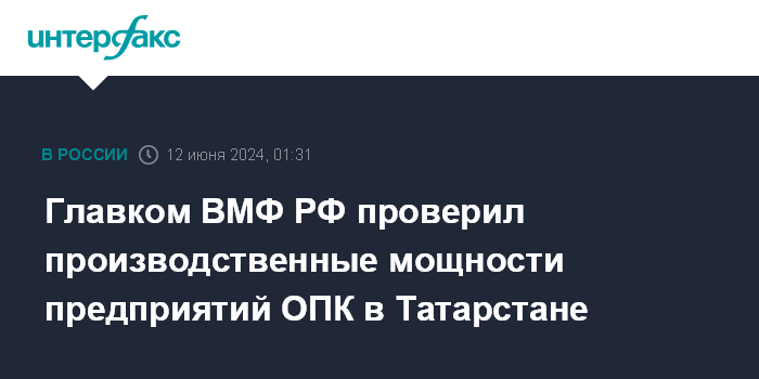 Москва. 12 июня. INTERFAX.RU - Главнокомандующий ВМФ России адмирал Александр Моисеев в рамках рабочей поездки в Татарстан проверил производственные мощности предприятий ОПК в республике.