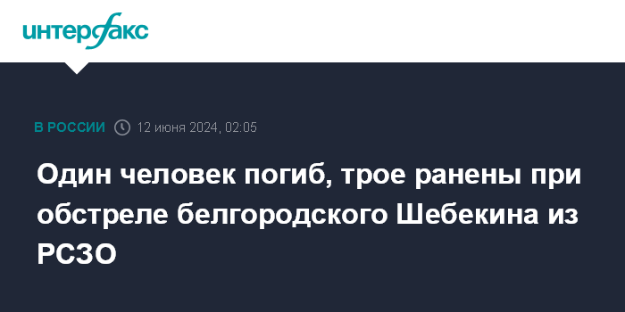 Москва. 12 июня. INTERFAX.RU - Губернатор Белгородской области Вячеслав Гладков в ночь на среду сообщил об одном погибшем и троих пострадавших в результате обстрела из РСЗО города Шебекино.