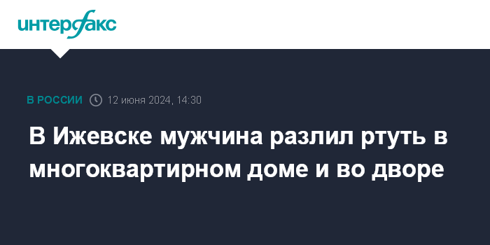 Москва. 12 июня. INTERFAX.RU - Следователи управления СКР по Удмуртии начали проверку после того, как ртуть разлилась во дворе одного из многоквартирных домов по улице Ворошилова в Ижевске, сообщает пресс-служба управления в среду.