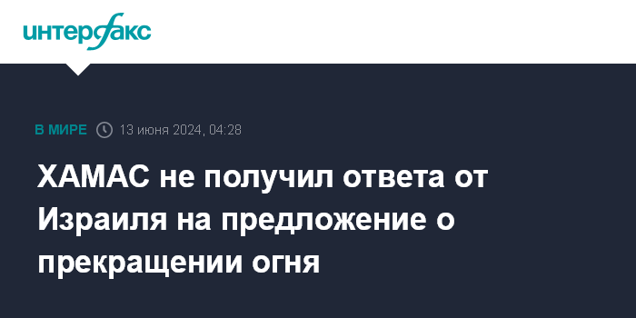 Москва. 13 июня. INTERFAX.RU - ХАМАС одобрительно отреагировал на озвученное президентом США Джо Байденом предложение по урегулированию в секторе Газа, однако не получил подтверждений, что с ним согласен Израиль, сообщают СМИ со ссылками на новое заявление движения.