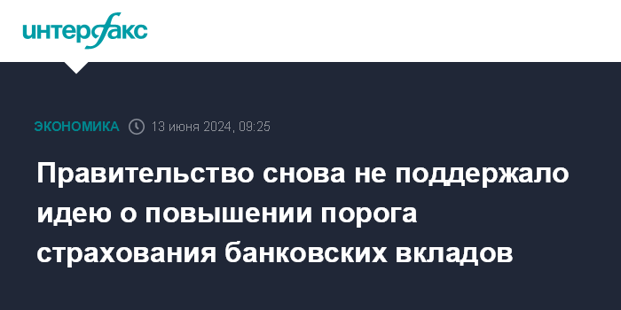 Москва. 13 июня. INTERFAX.RU - Правительство РФ направило в комитет Госдумы по финансовому рынку отзыв на законопроект о повышении порога страхования банковских вкладов с 1,4 млн до 3 млн рублей, в котором указало, что идея о повышении порога не поддерживается.