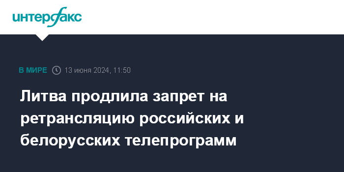 Москва. 13 июня. INTERFAX.RU - Литовский парламент продлил апрет на ретрансляцию телепрограмм России и Белоруссии, сообщает BNS.