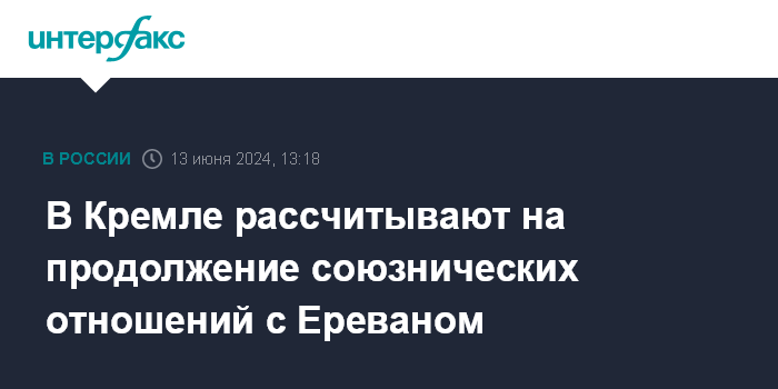Москва. 13 июня. INTERFAX.RU - Россия продолжит работу с Арменией для прояснения позиции Еревана по ОДКБ и рассчитывает, что взаимоотношения стран продолжатся в русле партнерства и союзничества, заявил пресс-секретарь президента РФ Дмитрий Песков.