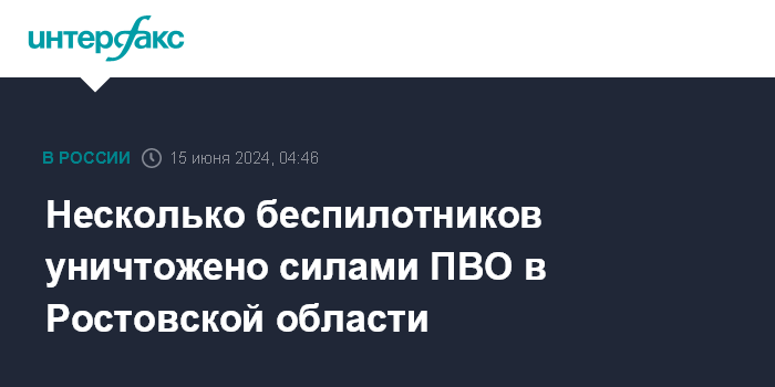 Москва. 15 июня. INTERFAX.RU - Губернатор Ростовской области Василий Голубев сообщил об уничтожении нескольких дронов средствами противовоздушной обороны (ПВО) в ночь на субботу в регионе.