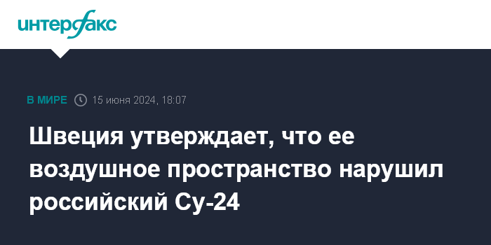 Москва. 15 июня. INTERFAX.RU - Шведские военные заявили в субботу, что российский бомбардировщик Су-24 нарушил воздушное пространство их страны в районе острова Готланд, сообщили европейские СМИ.